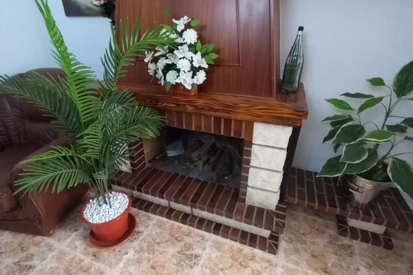 The large living room is attractive with a woodburner, chimney, and air conditioning.