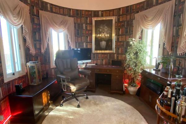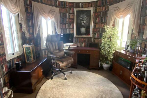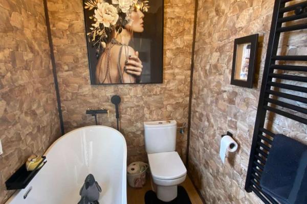 Inside the main villa, an elegant entrance hall leads the way. The interior blends modern touches with thoughtful details, including a stylish guest bathroom with a free-standing bathtub. The bright living room features an electric fireplace and a distinctive turret space perfect for an office or reading nook