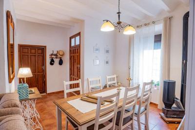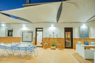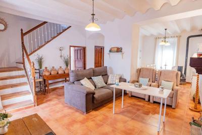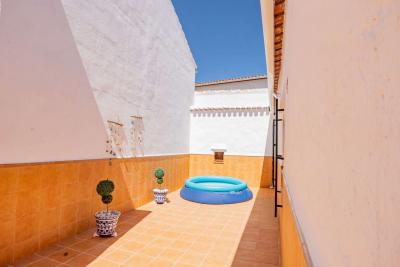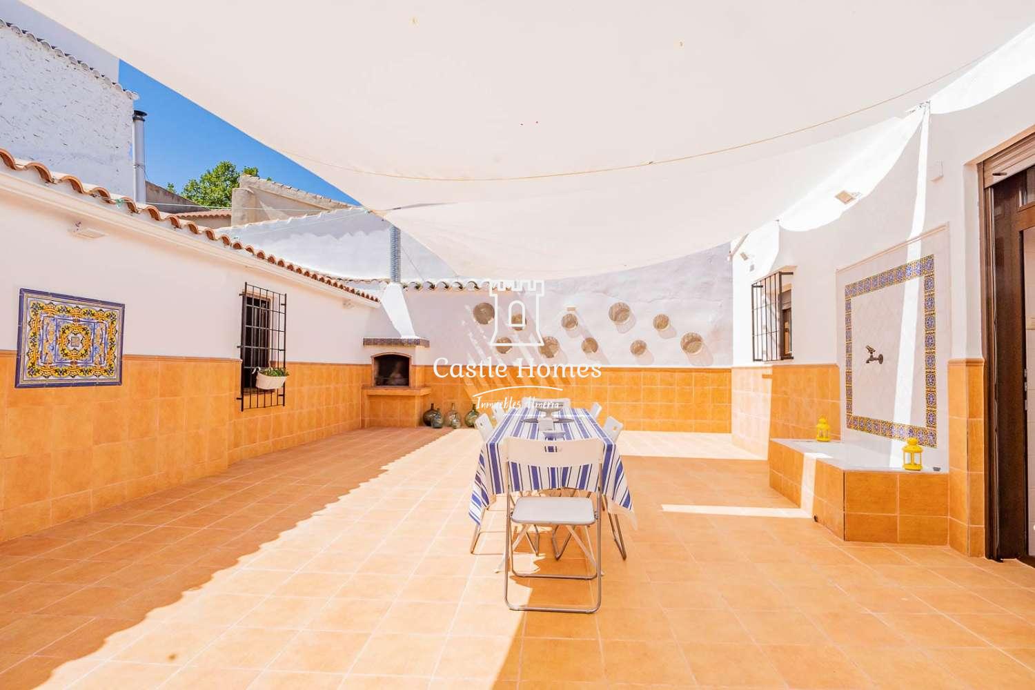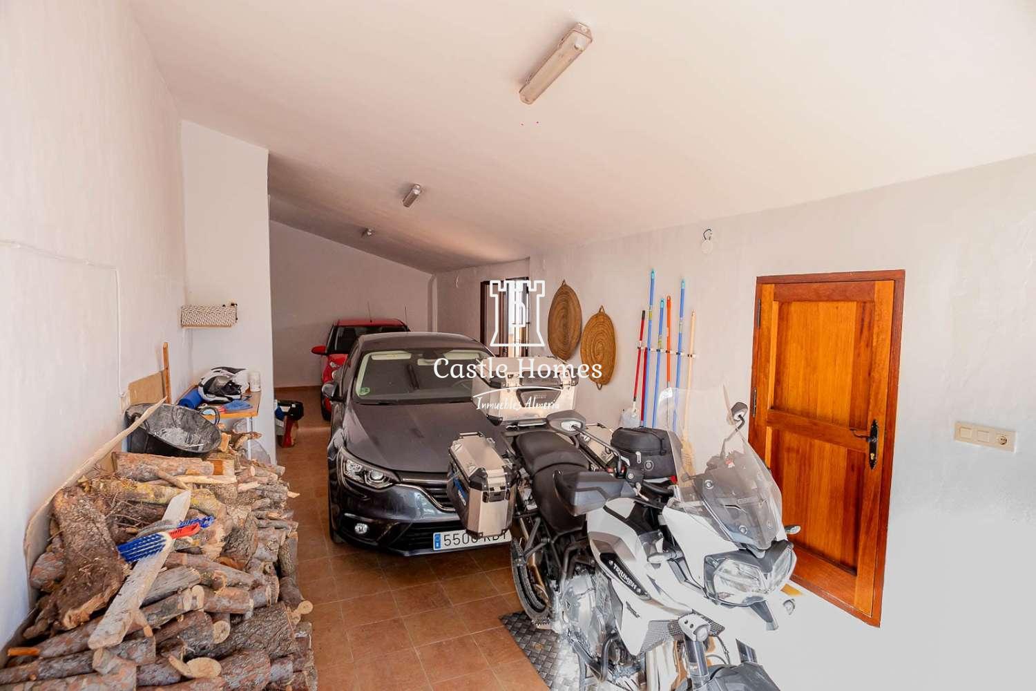 The exterior patio is large and open, approximately 125 m². It is enclosed, with direct access from the street and from the living room and kitchen. It is very spacious and features a beautiful Andalusian-style fountain and a built-in barbecue. There is also a spacious garage with an automatic door that opens from the street and provides access to the house's patio. It can accommodate two cars and offers ample storage space, as well as a designated area for the almond shells that fuel the stove inside the house.