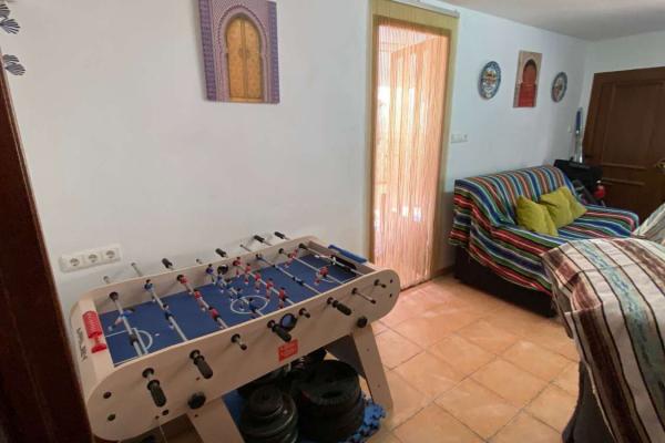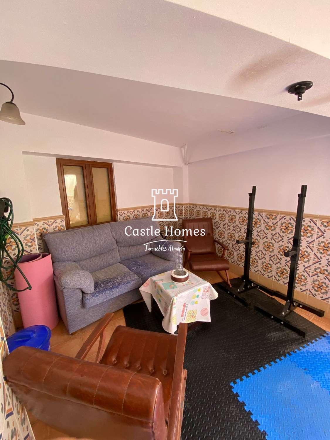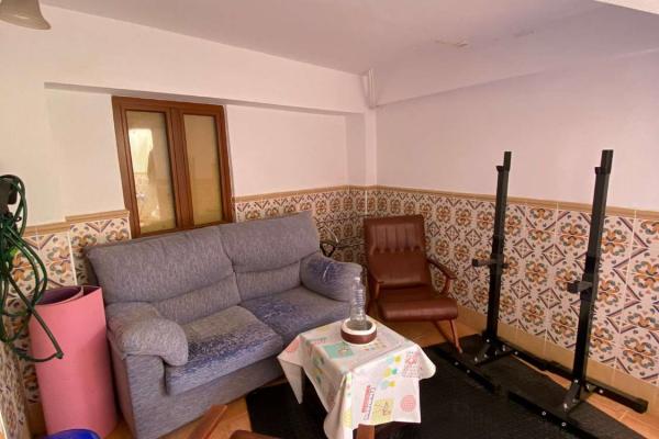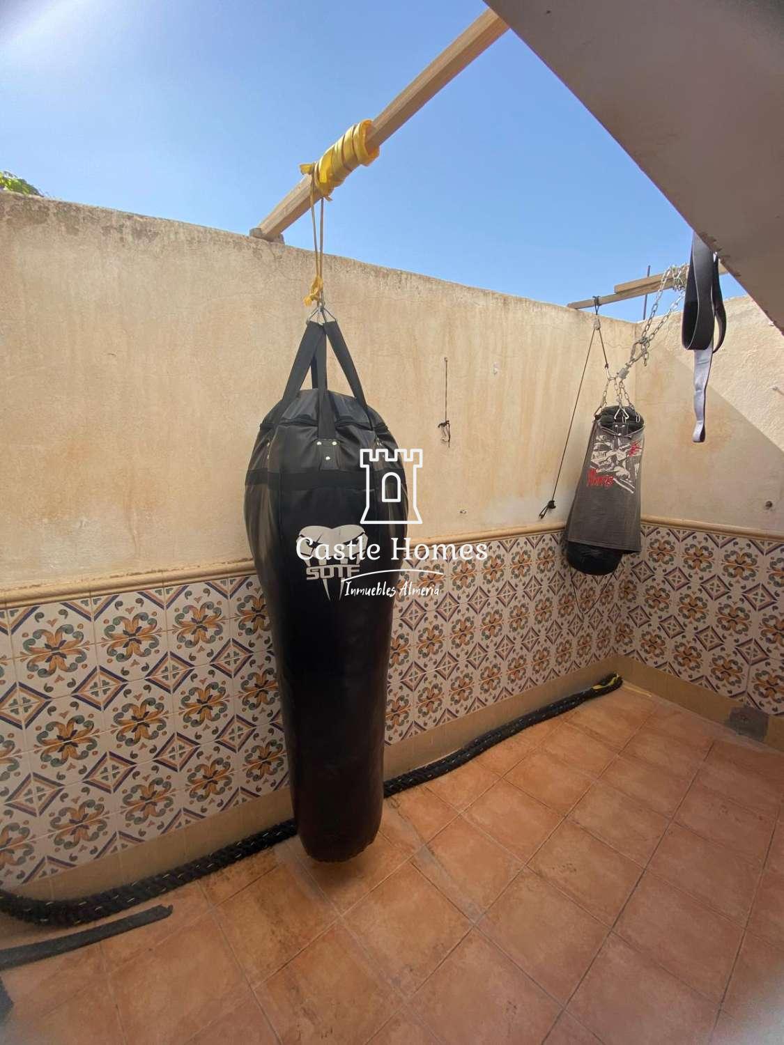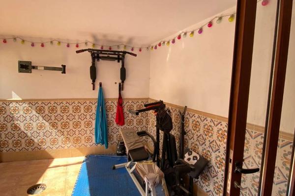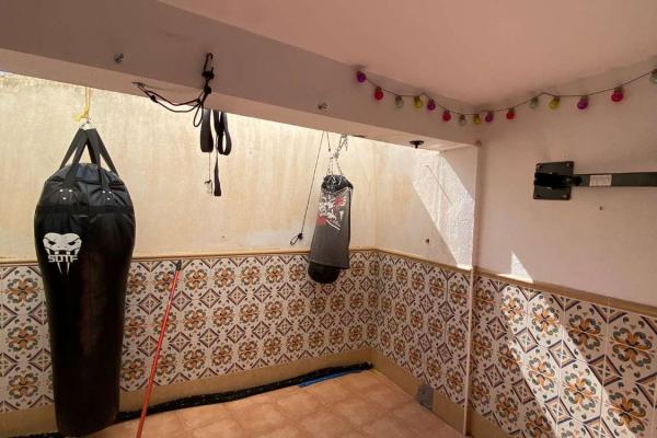 Desde esta sala se accede a una amplia zona exterior, parcialmente cubierta, que se utiliza como gimnasio y zona de estar. Desde este espacio se accede a un trastero/lavadero.