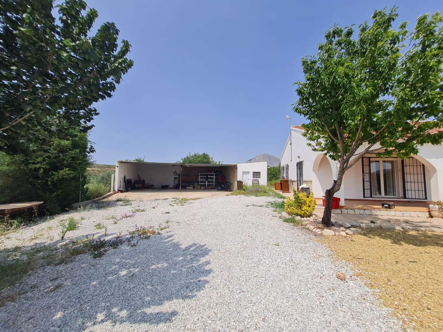 La propriété dispose de nombreux espaces extérieurs clôturés, avec un grand porche à l'entrée, parfait pour se prélasser et manger. Il y a une grande piscine avec des marches intégrées et du carrelage tout autour. De plus, il reste beaucoup d'espace dans la partie clôturée de la propriété, ce qui donne la possibilité d'utiliser cet espace comme vous le souhaitez.